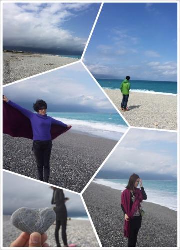 太魯閣後我們就去了七星潭。看到太平洋好興奮阿,海水很藍很藍。 相機的各種狂拍。海邊到處是鵝卵石,家裡人都紛紛撿幾顆留作紀念。我們還撿到一顆心形的石頭。