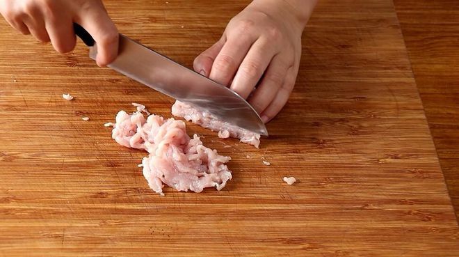 肉絲擠幹水分,放入碗中,加適量的料酒、鹽和白胡椒粉攪拌均勻。