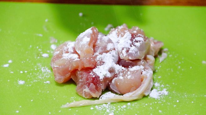 雞腿肉去骨留肉,把肉切成小丁,用點澱粉抹一下。