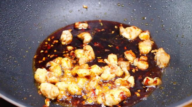 鍋留底油,開火,油熱放入雞肉翻炒,炒至雞肉變色。