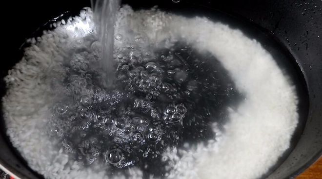 把大米倒入鍋中,倒入適量的水,大火煮,一直煮到大米破開。