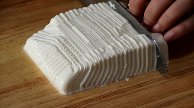 嫩豆腐切成薄片,再切成細絲。