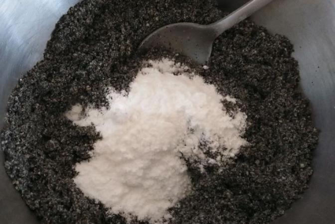 4、先用工具把糖研磨成糖粉,取出破壁機,倒入炒熟的黑芝麻,再加入二分之一的糖粉,啟動破壁機,把黑芝麻打成碎末。然後加入另一半的糖粉,繼續打一會兒,儘量打成細膩的粉末。打黑芝麻的時間不能太長,而要用研磨功能,不然芝麻油會滲出來。
