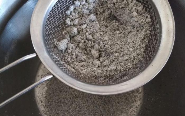5、把打好的黑芝麻粉倒入糯米粉中,用乾淨的筷子攪拌均勻,讓2種粉充分混合,黑芝麻糊就做好了,用濾網過篩。