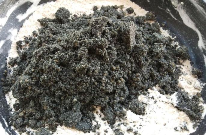3、把黑芝麻倒入炒鍋中,開小火加熱,慢慢炒幾分鐘,炒出黑芝麻的香味,顏色發黃後關火盛出,晾涼。再把糯米粉倒入鍋裡,同樣用小火炒幾分鐘,顏色發黃後盛出放涼。