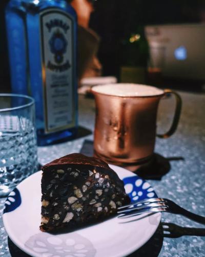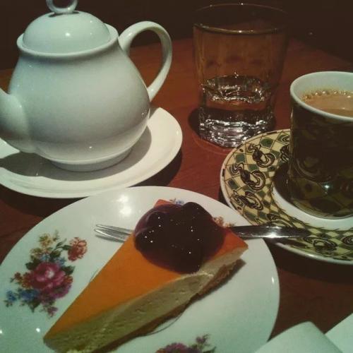 店內照片甜點是芝士蛋糕,有兩種口味,一種搭配藍莓醬,一種是有巧克力的,兩款蛋糕外形都普普通通,沒有花哨的裝飾,只是一塊蛋糕本來的樣子而已,但吃下的那一瞬間就真的是停不下來。