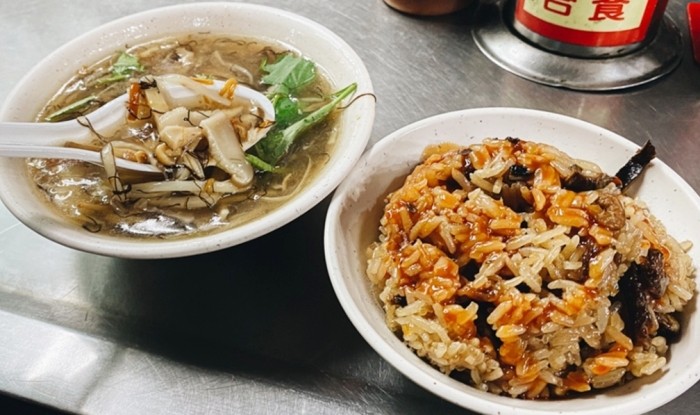 想吃飽一點、豐盛一點,絕對要試試「吳記」的螃蟹羹配油飯。這組合在基隆很經典,而華僑市場裡吳記算是老字號了。油飯粒粒分明,帶著麻油和香菇的香氣,不會過於油膩;主角螃蟹羹更是料多實在,滿滿的筍絲、蛋花、木耳絲,裡面還有好幾塊帶肉的螃蟹鉗,湯頭勾芡得剛剛好,濃稠滑順,帶著鮮甜和微微醋酸,非常開胃。把油飯稍微泡進羹湯裡一起吃,那種鹹香交融的滿足感,真的讓人停不下來。