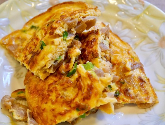 - 輕輕搖晃鍋子,確認底部可以滑動了,用一個大盤子輔助或小心地用兩個鍋鏟,將整片菜脯蛋翻面(翻面是技術活,別怕破,破了也是自家吃)。