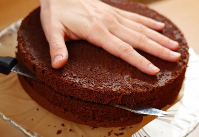 - 平切蛋糕體: 如果蛋糕頂部有隆起,用長鋸齒刀仔細地將蛋糕體橫切成兩片平整的圓片。可以稍微冷凍20分鐘再切會更好切。我的刀工很差,所以我後來都買蛋糕分片器輔助,效果不錯。