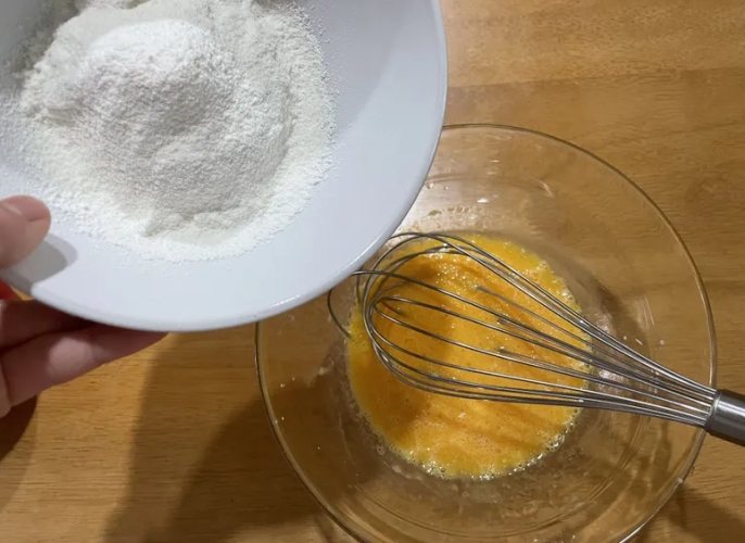 - 混合濕料: 把蛋黃和屬於蛋黃糊那份的細砂糖(20g)倒一起,用手動打蛋器攪拌均勻,讓糖溶化(看不到糖粒就行,不用打到發白)。