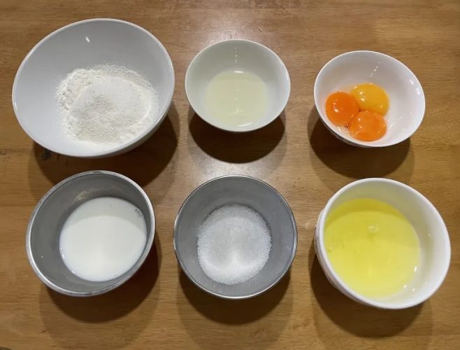 | 雞蛋 | 新鮮、大顆(60-65g/顆)、室溫 | 用冰蛋、蛋不新鮮、分蛋沾到蛋黃/水/油 | 早點拿出來退冰,分蛋用乾淨小碗接力 |