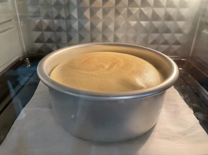 - 看高度: 蛋糕體膨脹到最高點後,會稍微回落一點點,並穩定在一個高度。
