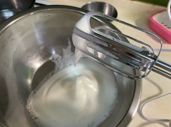 - 低速起泡: 用電動打蛋器低速把蛋白打到出現粗大氣泡(像魚眼泡泡)。