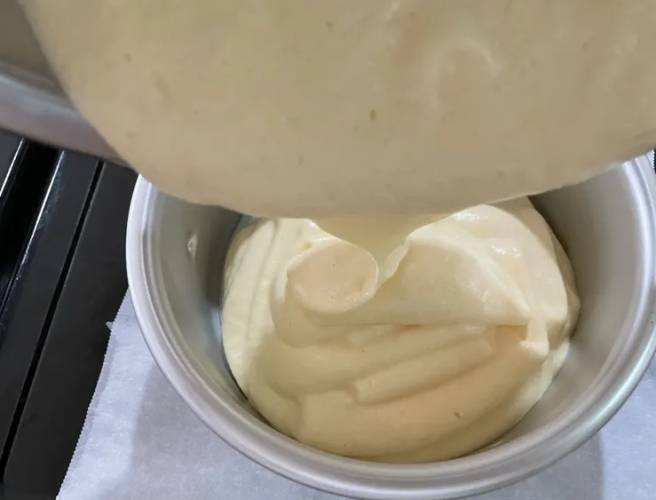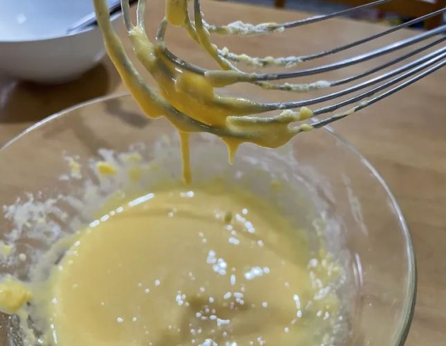 - 檢查狀態: 拌好的麵糊應該是充滿光澤、蓬鬆、緩緩流動的狀態。舀起一坨掉回去,痕跡會慢慢消失(但不會立刻消失)。