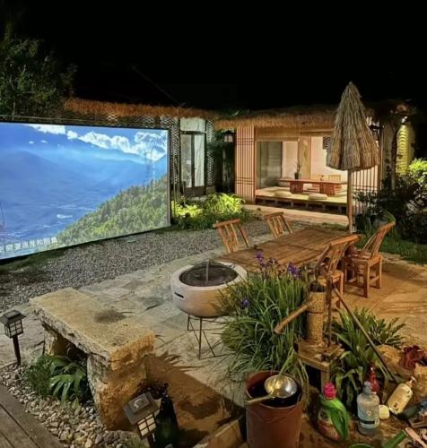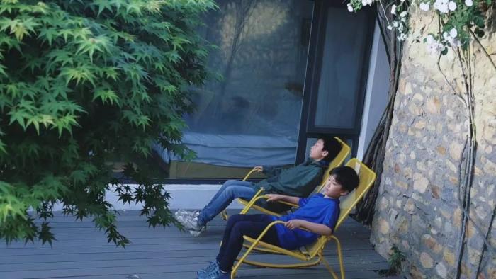 坐在民宿的院子裡