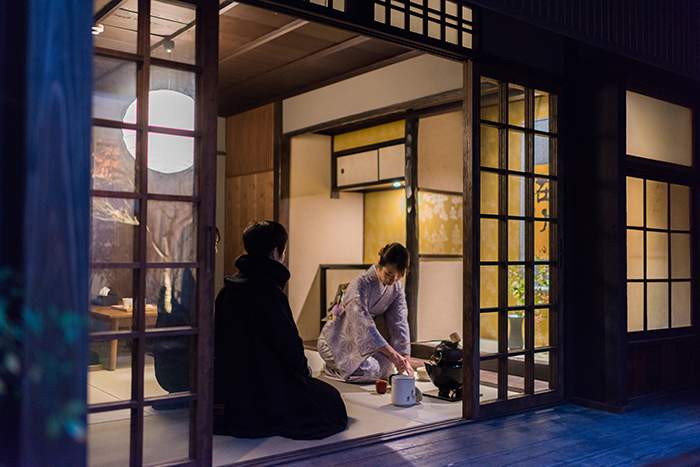 裡側的榻榻米房間是生活區“中戶”,牆面如舊時一樣使用竹篾、泥草與和紙建造而成,可以邊品茶邊觀賞小巧的日本庭院。這大概就是人們想象中的舊日京都生活感,時光的流轉在這裡似乎不露痕跡。